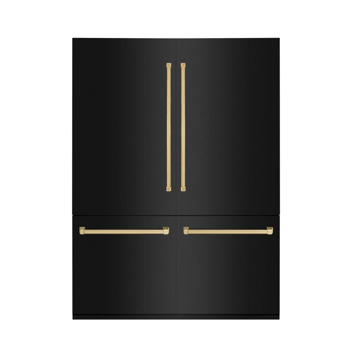 ZLINE Autograph Edition 60 in. 32.2 cu. ft. French Door Built-In Bottom Freezer Refrigerator with Water Dispenser and Ice Maker in Black Stainless Steel with Polished Gold Accents (RBIVZ-BS-60-G) front. Next to panels and handles.