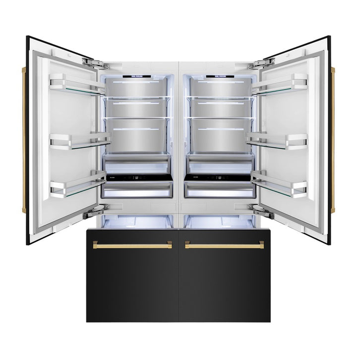 ZLINE Autograph Edition 60 in. 32.2 cu. ft. French Door Built-In Bottom Freezer Refrigerator with Water Dispenser and Ice Maker in Black Stainless Steel with Polished Gold Accents (RBIVZ-BS-60-G) front, open.