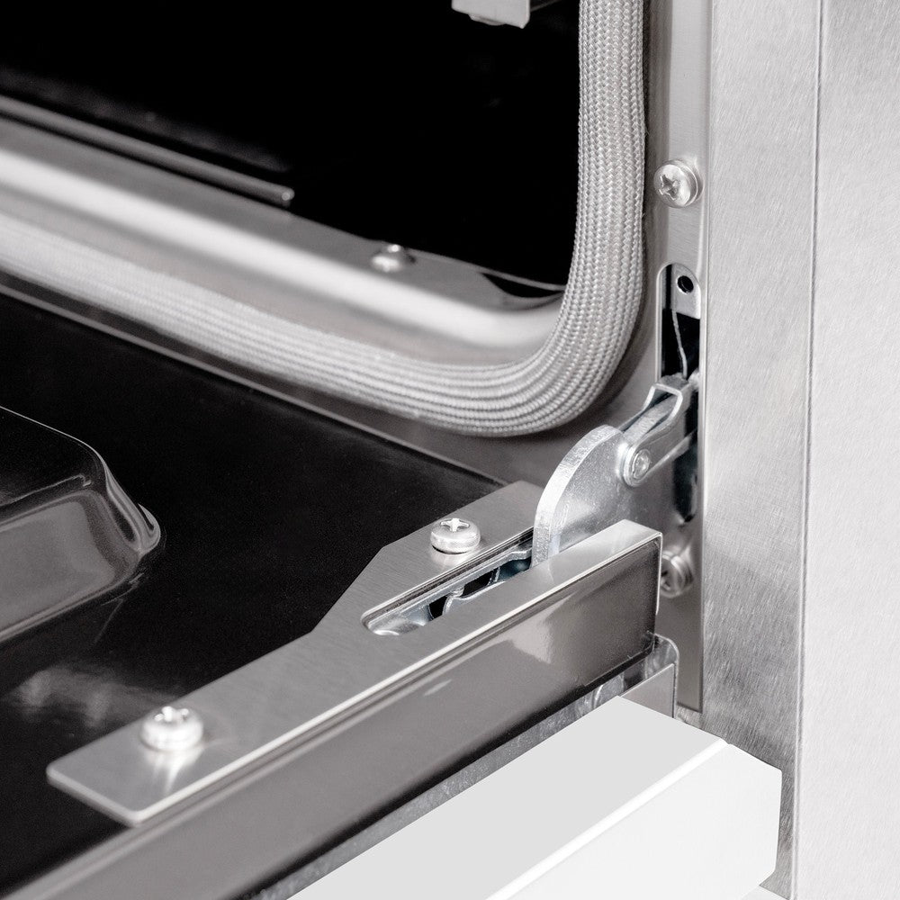 ZLINE 30 in. 4.2 cu. ft. Classic Gas Range with 4 Burner Cooktop and Convection Gas Oven in Satin Stainless Steel with White Matte Door (CGRS-WM-30) StayPut oven door hinge.