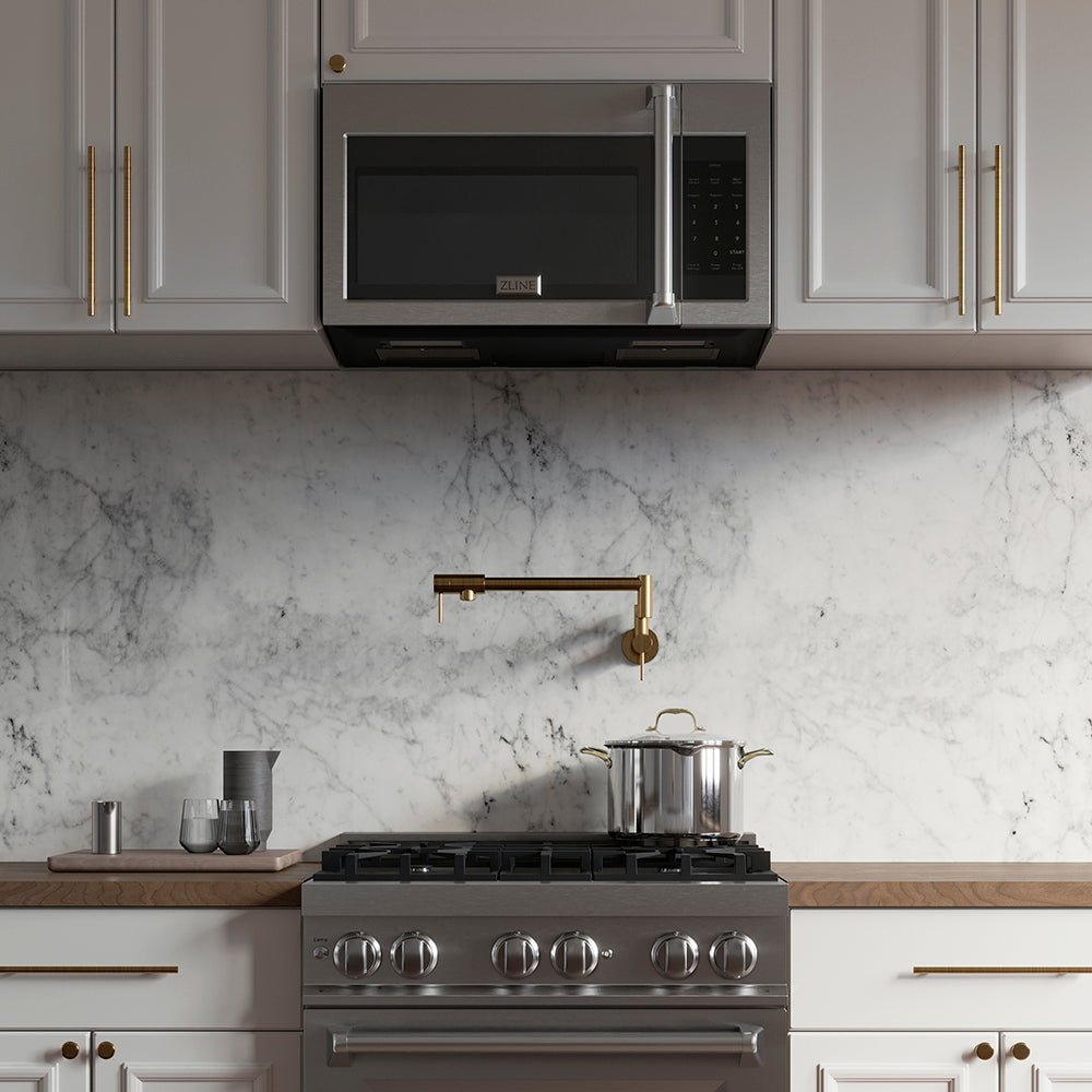 ZLINE 30 in. Stainless Steel Over the Range Convection Microwave Oven with Traditional Handle (MWO-OTR-H-30) in a white marble kitchen with wood details.