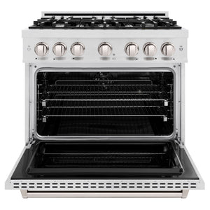 ZLINE 36 in. 5.2 cu. ft. Classic Dual Fuel Range with 6 Burner Gas Cooktop and Electric Convection Oven in Satin Stainless Steel (CDRS-36) front, oven open.