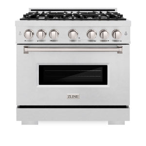 ZLINE 36 in. 5.2 cu. ft. Classic Dual Fuel Range with 6 Burner Gas Cooktop and Electric Convection Oven in Satin Stainless Steel (CDRS-36) knobs and handle.