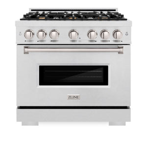 ZLINE 36 in. 5.2 cu. ft. Classic Gas Range with Convection Gas Oven in Satin Stainless Steel with 6 Brass Burners (CGRS-BR-36) knobs and handle.