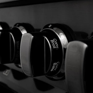 ZLINE 36 in. 4.6 cu. ft. Legacy Dual Fuel Range with Gas Cooktop and Electric Convection Oven in Black Stainless Steel with 6 Brass Burners (RAB-BR-36) side, control knobs close-up.