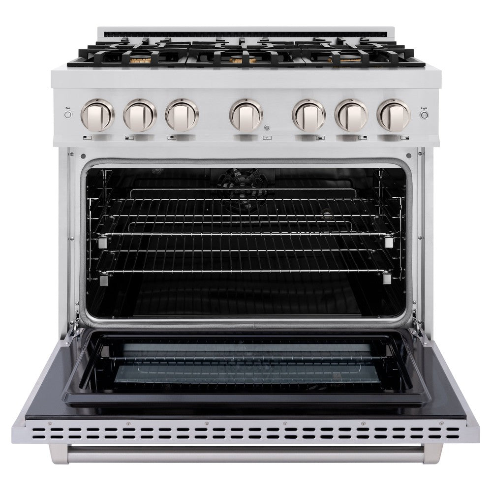 ZLINE 36 in. 5.2 cu. ft. Select Dual Fuel Range with Gas Cooktop and Electric Convection Oven in Stainless Steel with 6 Brass Burners (HDR-BR-36) front, oven open.