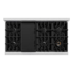 ZLINE 48 in. 6.7 cu. ft. Classic Double Oven Gas Range with 8 Burner Cooktop in Satin Stainless Steel with White Matte Doors (CGRS-WM-48) top-down, above cooktop.