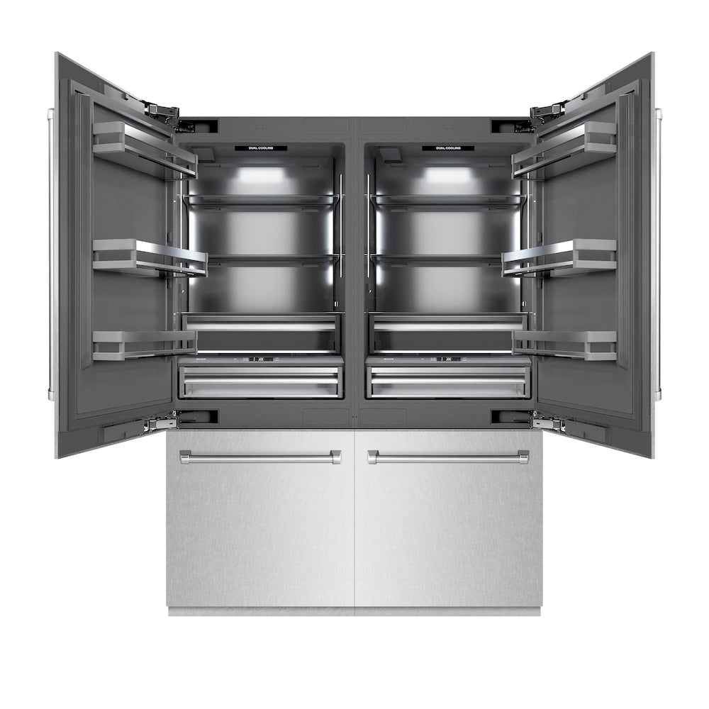 ZLINE 60 in. 32.2 cu. ft. French Door Built-In Bottom Freezer Refrigerator with Water Dispensers and Ice Makers in Satin Stainless Steel with Graphite Gray Interior (GRBIV-SN-60) front, open.