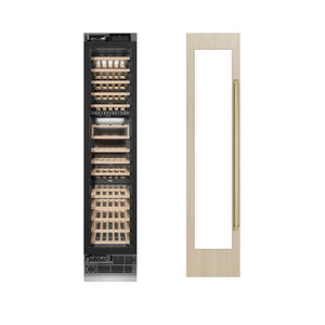 ZLINE Autograph Edition 18 in. 9.0 cu. ft. Triple Zone 68 Bottle Panel Ready Left Hinge Column Wine Cooler with Polished Gold Accents (RBCWVLZ-18-G) front, next to custom panels and handles.