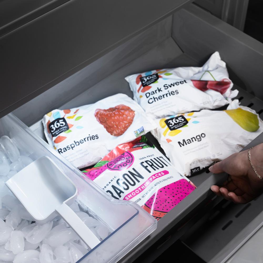 • Full-Width Pantry Drawer - A full-width pantry drawer provides substantial storage for fruits, vegetables, and other food items you want to keep fresher longer