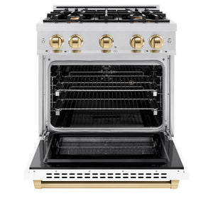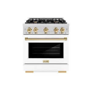 ZLINE Autograph Edition 30 in. 4.2 cu. ft. Select Dual Fuel Range with 4 Burner Gas Cooktop and Electric Convection Oven in Satin Stainless Steel with White Matte Door and Polished Gold Accents (HDRSZ-WM-30-G)