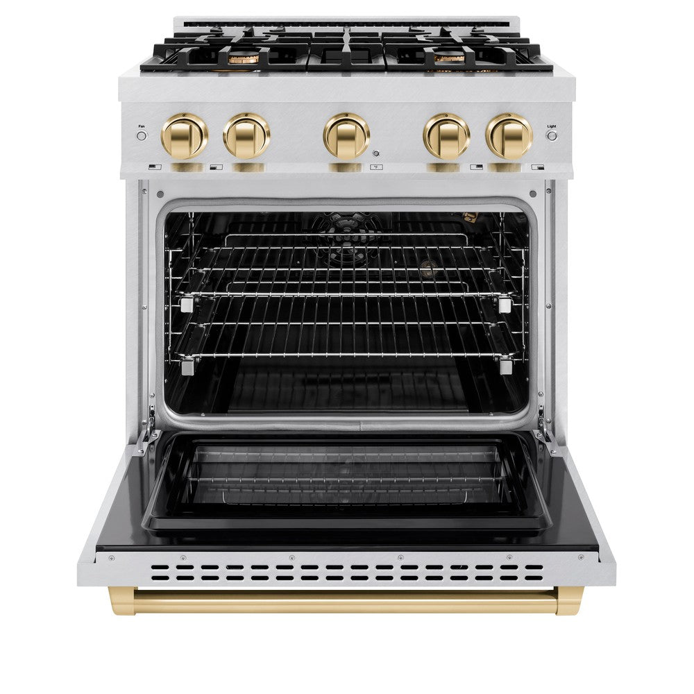 ZLINE Autograph Edition 30 in. 4.2 cu. ft. Select Gas Range with 4 Burner Cooktop and Convection Gas Oven in Satin Stainless Steel and Polished Gold Accents (HGRSZ-30-G) front, oven open.