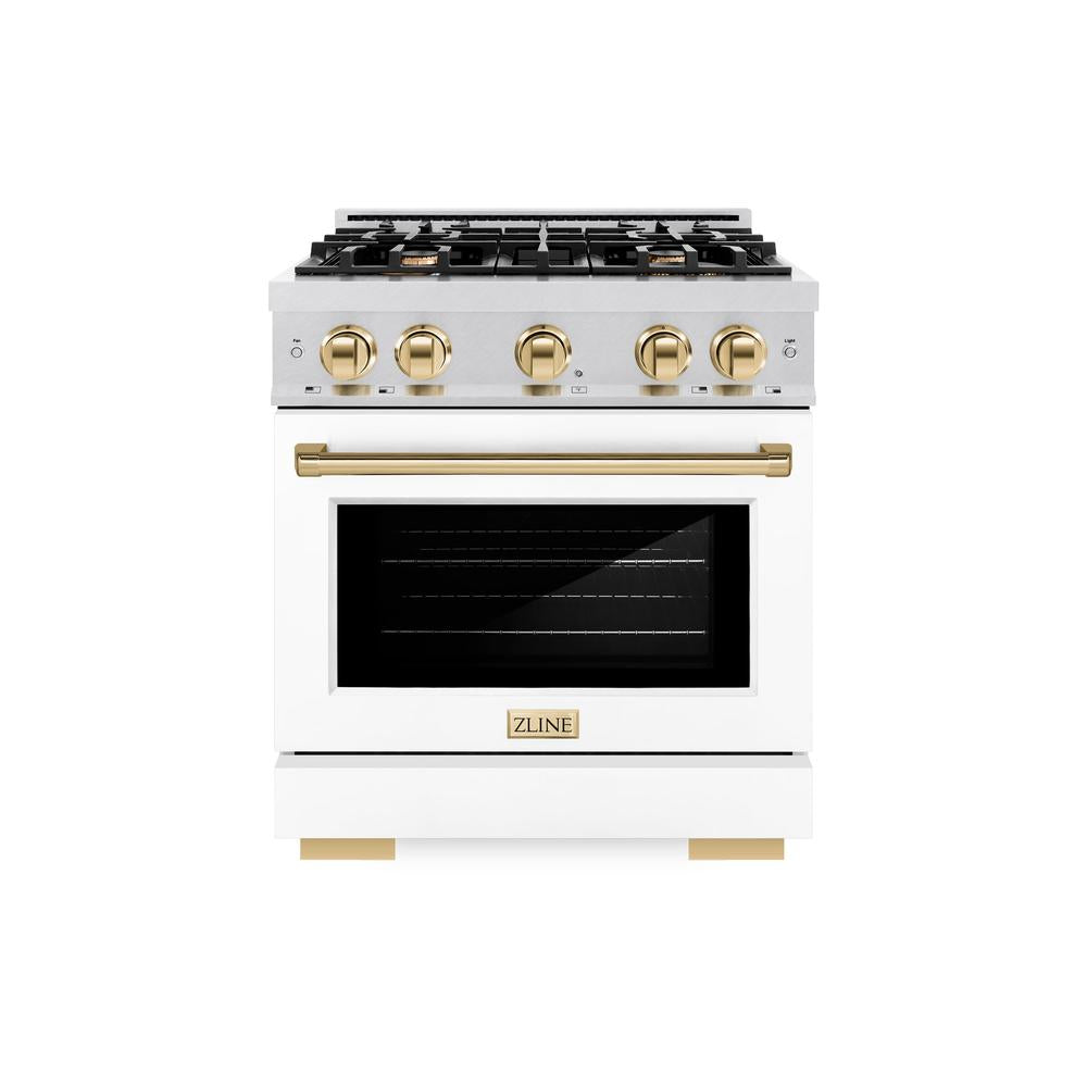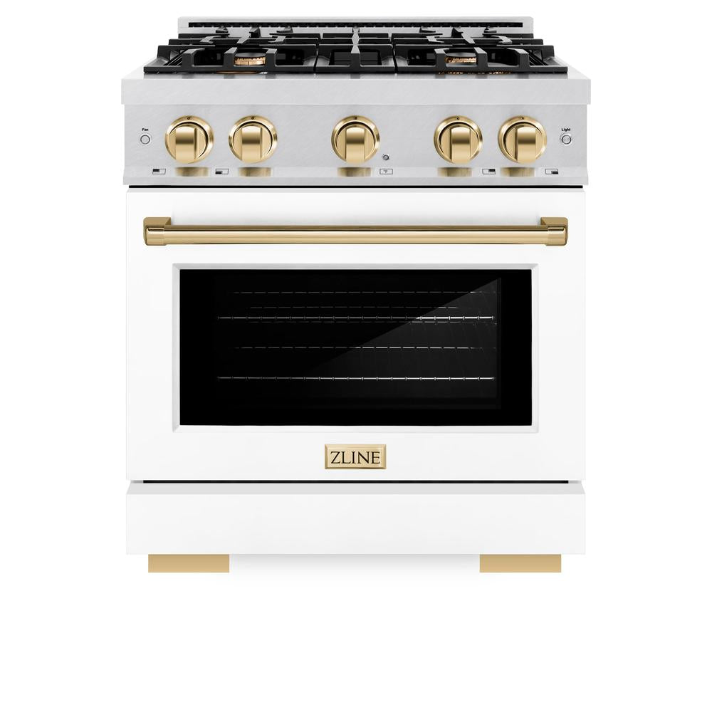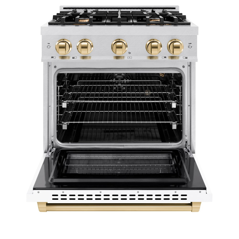 ZLINE Autograph Edition 30 in. 4.2 cu. ft. Select Gas Range with 4 Burner Cooktop and Convection Gas Oven in Satin Stainless Steel with White Matte Door and Polished Gold Accents (HGRSZ-WM-30-G)