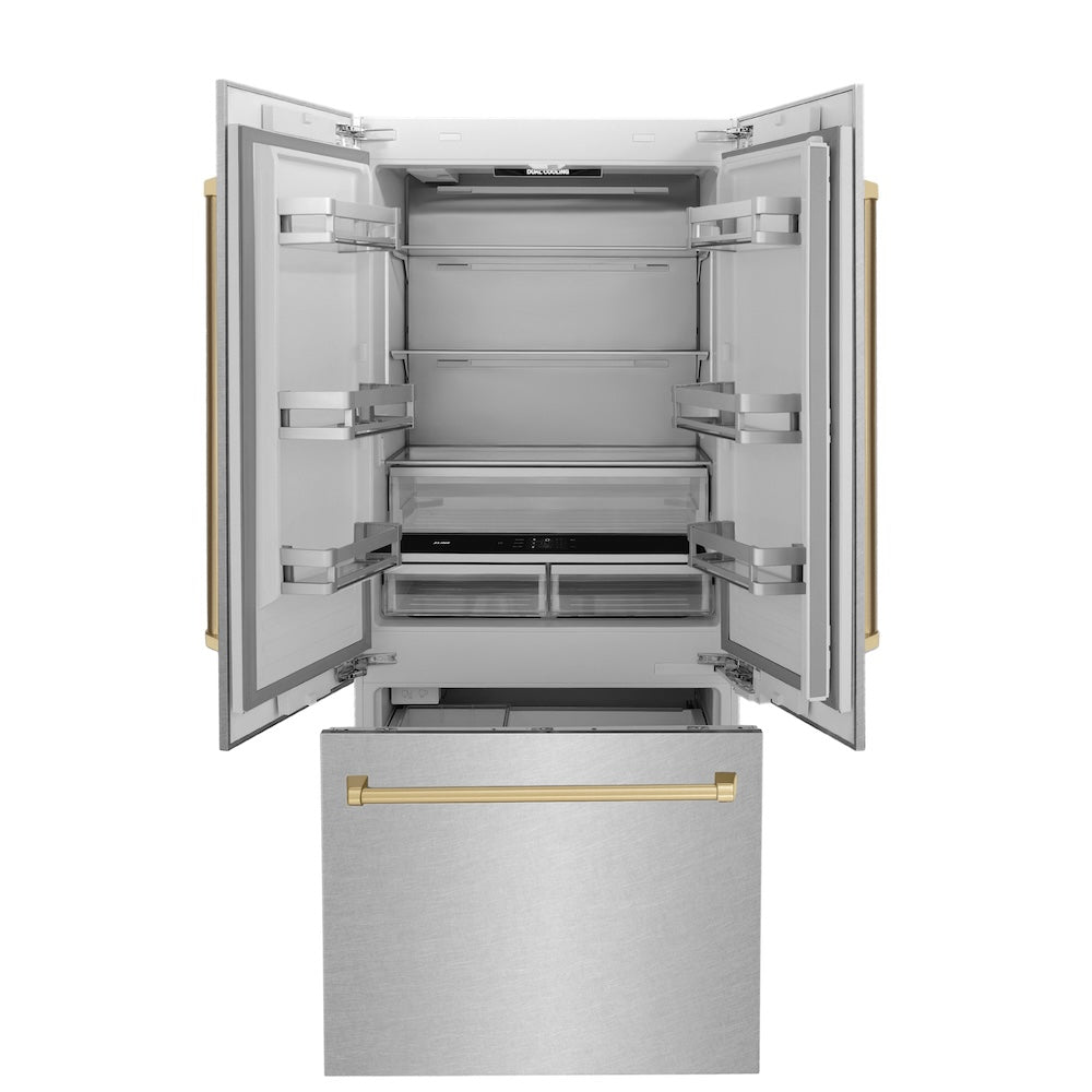 ZLINE Autograph Edition 36 in. 19.6 cu. ft. French Door Built-In Bottom Freezer Refrigerator with Water Dispenser and Ice Maker in Satin Stainless Steel with Champagne Bronze Accents (RBIVZ-SN-36-CB) using bottom freezer drawers.