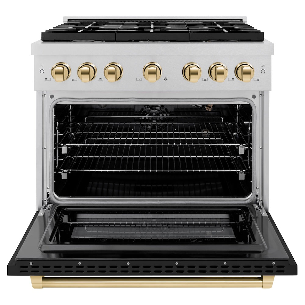 ZLINE Autograph Edition 36 in. 5.2 cu. ft. Paramount Gas Range with 6 Burner Cooktop and Convection Gas Oven in Satin Stainless Steel with Black Matte Door and Polished Gold Accents (SGRSZ-BLM-36-G) front, open.