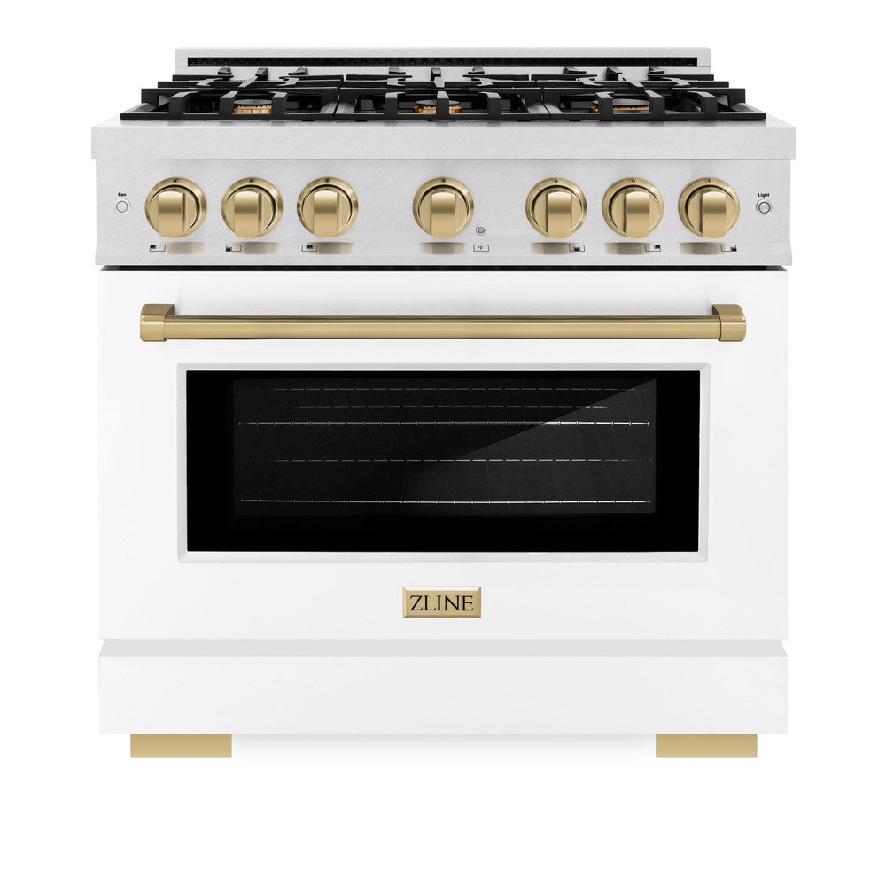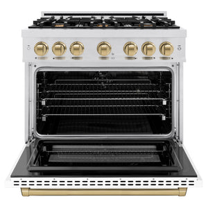 ZLINE Autograph Edition 36 in. 5.2 cu. ft. Select Dual Fuel Range with 6 Burner Gas Cooktop and Electric Convection Oven in Satin Stainless Steel with White Matte Door and Champagne Bronze Accents (HDRSZ-WM-36-CB)