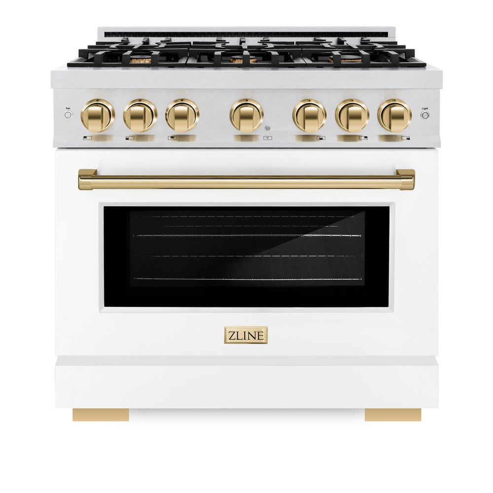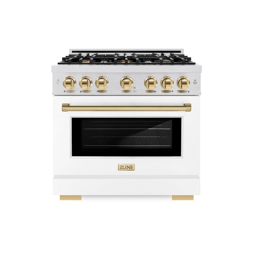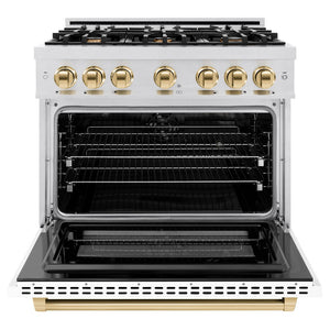 ZLINE Autograph Edition 36 in. 5.2 cu. ft. Select Dual Fuel Range with 6 Burner Gas Cooktop and Electric Convection Oven in Satin Stainless Steel with White Matte Door and Polished Gold Accents (HDRSZ-WM-36-G)