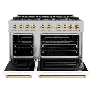 ZLINE Autograph Edition 48 in. 6.7 cu. ft. Classic Double Oven Gas Range with 8 Burner Cooktop in Satin Stainless Steel with White Matte Doors and Polished Gold Accents (CGRSZ-WM-48-G)