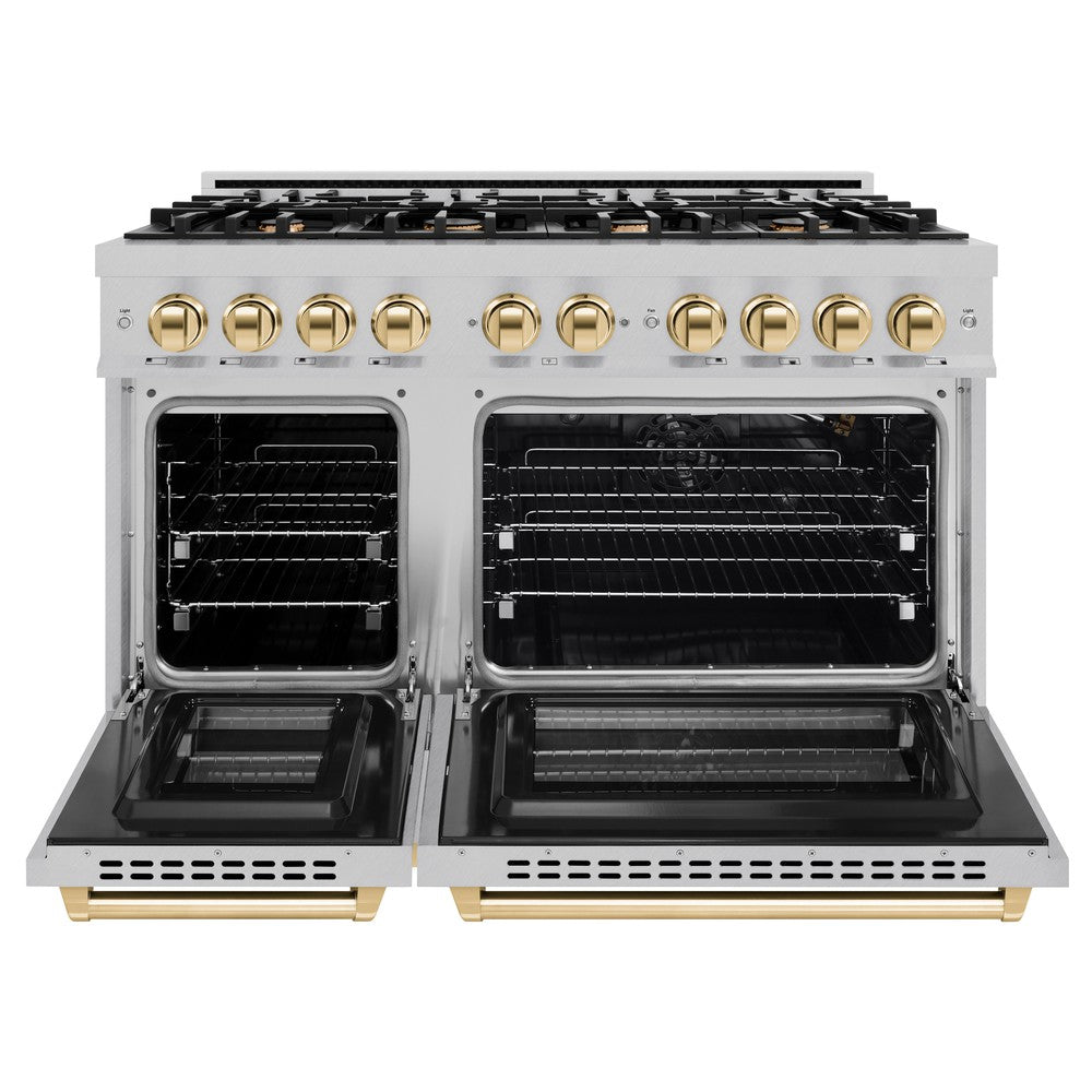 ZLINE Autograph Edition 48 in. 6.7 cu. ft. Select Double Oven Gas Range with 8 Burner Cooktop in Satin Stainless Steel and Polished Gold Accents (HGRSZ-48-G) front, oven open.