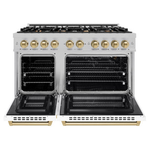 ZLINE Autograph Edition 48 in. 6.7 cu. ft. Select Double Oven Gas Range with 8 Burner Cooktop in Satin Stainless Steel with White Matte Doors and Champagne Bronze Accents (HGRSZ-WM-48-CB)