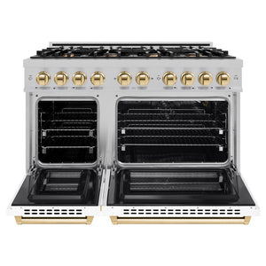 ZLINE Autograph Edition 48 in. 6.7 cu. ft. Select Double Oven Gas Range with 8 Burner Cooktop in Satin Stainless Steel with White Matte Doors and Polished Gold Accents (HGRSZ-WM-48-G)