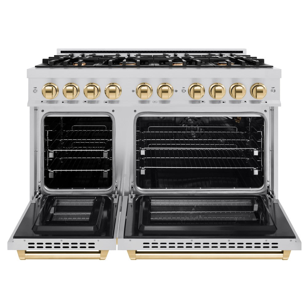 ZLINE Autograph Edition 48 in. 6.7 cu. ft. Select Double Oven Gas Range with 8 Burner Cooktop in Stainless Steel and Polished Gold Accents (HGRZ-48-G) front, oven open.